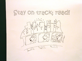 I attacked it the way I attacked the dearth of science posters a few years ago: with clip art and the overhead projector. Decidedly low tech, but also low or no cost, it worked for me. Luckily, my artistic daughter and my husband’s knowledge of trains provided the needed boost to make these posters come alive. Here’s the rough draft of the “Read” poster.