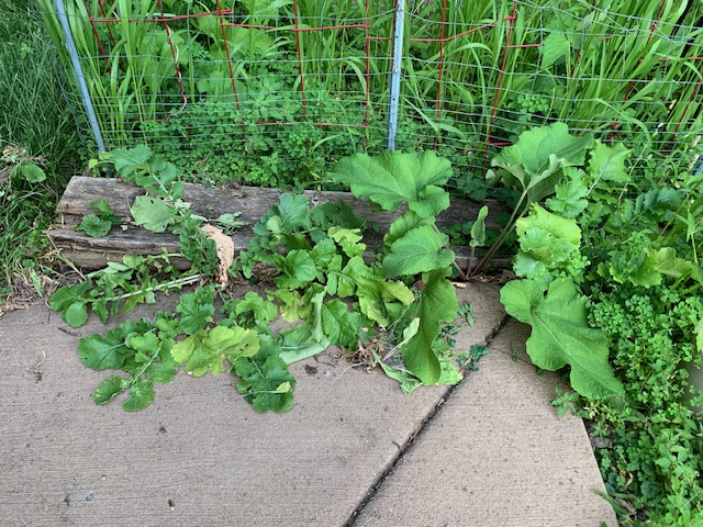 I definitely didn’t plant turnips here. I blame the squirrels or chipmunks, those tricky little furballs. Some tiny critter moved seeds or ate seeds and pooped them into this cozy little spot. And they grew. Grew and grew and grew.