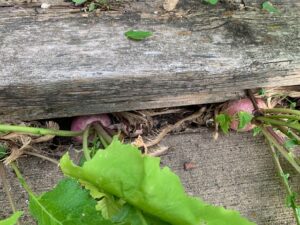 I was pulling out weeds, mostly burdock, when I yanked on one that wouldn’t come out from the ground next to a walkway board.