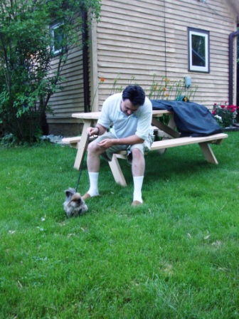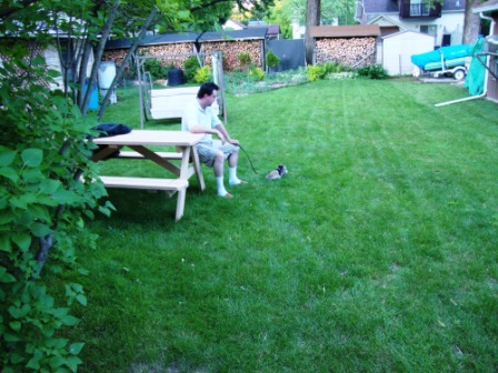 It was a long weekend for Chuck, so he relaxed and spent some time with the bunnies. See that little lump of fur at the end of the leash? That’s Krumpet. She’s a tiny lionhead rabbit – a ball of fur that hops.