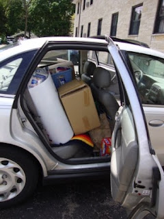 While La Petite was graduating, Chuck was packing things in boxes and loading the minivan. He filled most of the minivan, and then he piled the two bunnies in their cages on top of the boxes, directed Amigo into the front seat, and headed home.