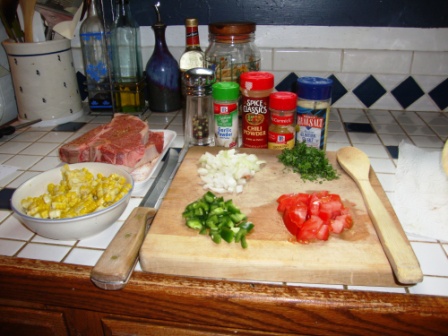 Chuck may not realize it, but watching him cook is aesthetically pleasing. Besides the aromas wafting through the house, he has a knack for gathering all the ingredients in a visual artistic kind of way. Here’s today’s recipe, in progress. He gets full points for presentation, both during cook time and on the table.
