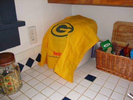 In the bathroom, I can wash up with a classic and well-used Green Bay washcloth.